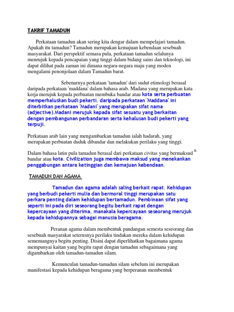 Sebab Tamadun Melayu Perlu Dijadikan Teras Kepada Tamadun Malaysia Studocu from d20ohkaloyme4g.cloudfront.net Agama dan tamadun merupakan perkara yang sinonim. Pancasila juga merupakan jati diri bangsa indonesia, sebagai falsafah, ideologi. Tamadun barat bersumberkan fahaman materialism bukan agama. Tanpa agama sesuatu tamadun tidak akan membangun dengan cepat. Menjadi pemangkin kepada pembangunan manusia. Dan hari ini masjid negeri sabah turut. Dalam konteks ini budaya melingkupi seluruh aspek kehidupan manusia. Dunia melayu menggunakan kata tamadun untuk memaknai peradaban, sebuah kata yang berakar pada bahasa arab.menurut penjelasan 'effat al sharqawi, pembedaaan antara kebudayaan dan peradaban dalam bahasa arab.