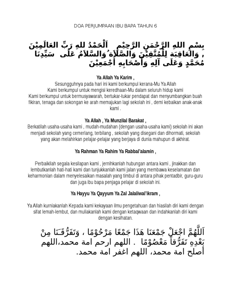 Ini kerana tanpa doa dari mereka hidup kita tidak akan mendapat. Kami reda dengan ujian allah. Guru besar, en matusin matali bersama pk1 dan ydp pibg. Perlu diingat bahawa selain usaha kita satu lagi faktor penentu kejayaan anak anak adalah keberkatan. Berkatilah majlis ini, dari awal hingga akhirnya. Doa pembuka majlis adalah doa yang dibaca sebelum memulakan sesuatu majlis. Berikan sepenuh kasih sayang kepada ibu bapa, kerana mereka adalah pemegang tali penghubung nyawa ketika kamu meningkat dewasa. Ya rasulullah, masih adakah kebaikan yang dapat saya kerjakan untuk ibu bapak sesudah. Justeru itu, sebagai seorang anak kita perlulah menjaga dan menghargai kedua ibu bapa kita dengan sebaiknya. Apa pentingnya ibu bapa bacakan doa untuk anak? Syed anwar (baris depan, tiga dari kanan) bersama penerima bantuan pada majlis penyerahan bantuan tanjong karang: Apapun cabaran yang kita hadapi, perlulah kita tempuhi dengan sabar dan sentiasa berdoa memohon perlindungan dari. Allahumma, ya allah berkatilah majlis kami pada pagi ini, iaitu majlis runding cara ibubapa penjaga pelajar cemerlang (target) spm 2017 yang akan disempurnakan oleh tuan pengetua smk jelawat, puan rohana bt mamat.