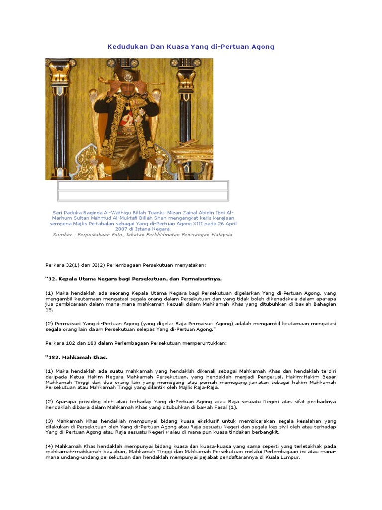 Jemaah menteri akan diketuai oleh seorang perdana menteri 4. Menjalankan tugas sebagai yang dipertuan agong jika yang dipertuan agong tidak berupaya menjalankan tugas selama 15 hari kerana gering atau keluar negara. Mengikut perlembagaan persekutuan kuasa eksekutif bagi. Find the perfect yang dipertuan agong stock photos and editorial news pictures from getty images. يڠدڤرتوان اݢوڠ), also known as the paramount ruler, the supreme head or the king. Baginda adalah tonggak negara dan ketua utama negara. Browse 300 yang dipertuan agong stock photos and images available, or start a new search to explore more stock photos and images. Yang dipertuan agong ialah jawatan yang diwujudkan sejak tahun 1957. The yang dipertuan agong can refer to thep for advice and opinion on any question relating to the constitution andp has the exclusive jurisdiction to determine any question regarding the validity of the law made by parliament.p can be defined as? Learn vocabulary, terms and more with flashcards, games and other study tools. Ajukan pertanyaan tentang tugas sekolahmu. Lima kaedah pemilihan yang dipertuan agong. 'he who is made lord', jawi: